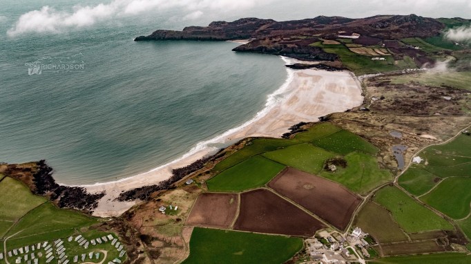 Aerial shot taken by Wil Richardson, very low tide, March 2019. Porthsele beach connected to Whitesands beach